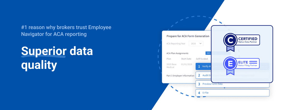 We’re excited to announce that our ACA filing partner, Nelco, has formally recognized Employee Navigator as both a Certified Nelco Data Partner and Elite Nelco Filing Partner, solidifying our position as one of the leading ACA products for brokers.